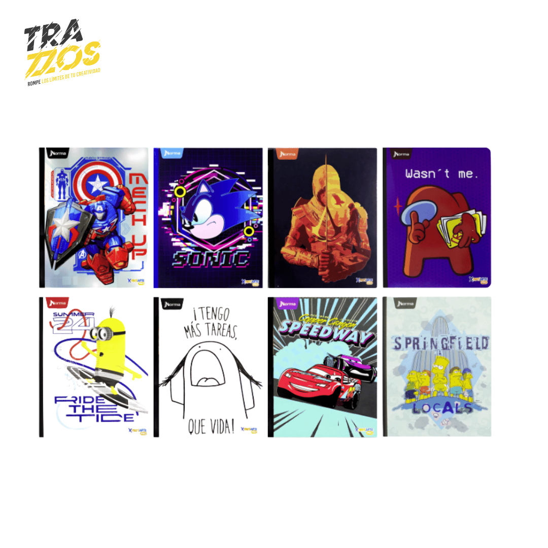 El Cuaderno Norma X-Presarte Cosido Intermedia Masculino ofrece resistencia y diseño en un formato pensado para estudiantes que buscan practicidad y personalidad. Cuenta con costura ultra resistente protegida con cinta de lomo en color negro y carátulas con repuje que destacan por sus ilustraciones inspiradas en memes, personajes de Los Simpsons, Assassin’s Creed, Among Us, Ultra Zombies, Avengers y Sonic, entre otros. Sus reversos personalizados y hoja de stickers propia permiten mayor personalización. Disponible en rayado, cuadriculado y ferrocarril, con presentaciones de 50 y 100 hojas, es una opción ideal para quienes disfrutan cuadernos con temática divertida y acabados de calidad.