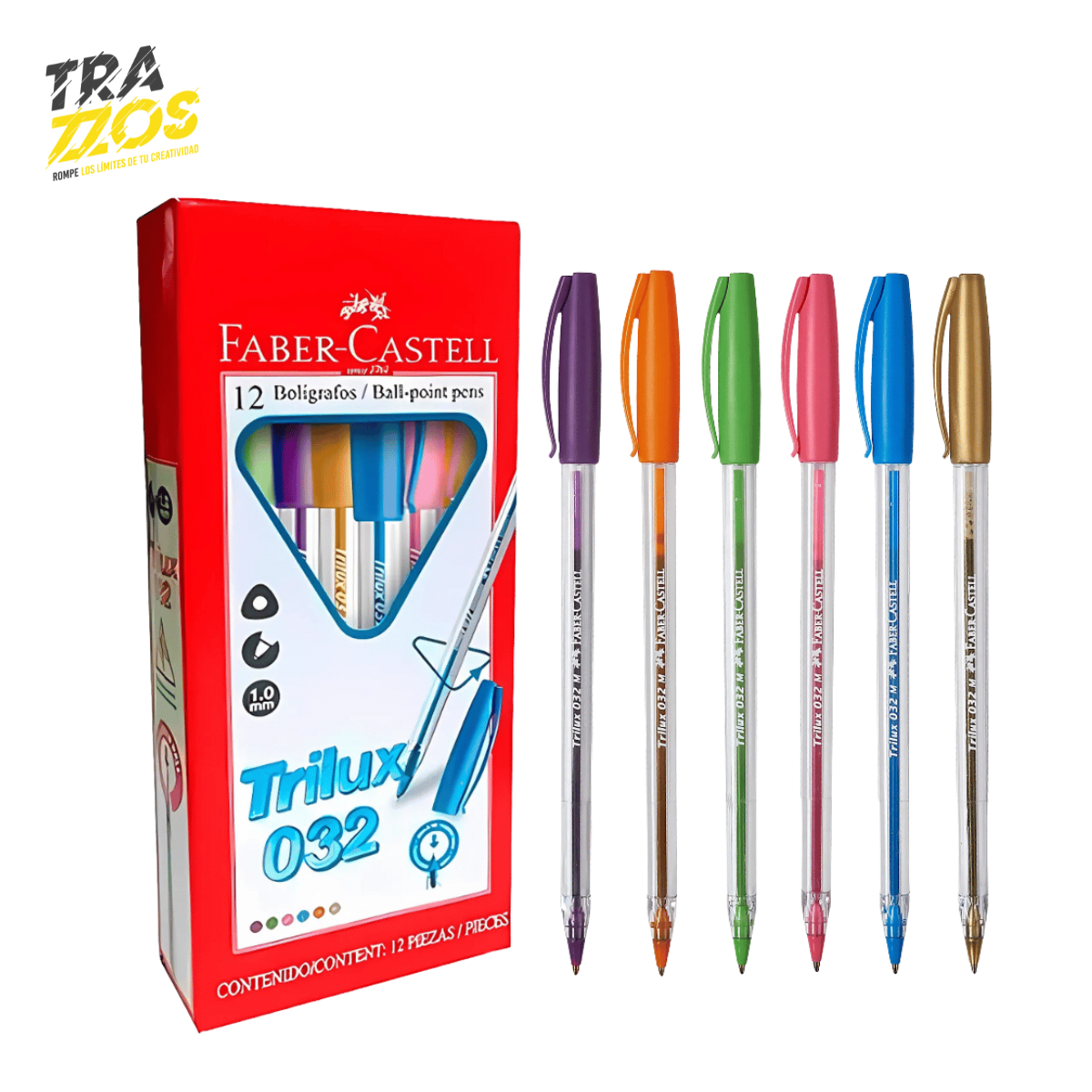 Set de 12 bolígrafos Faber-Castell Trilux 032 con punta de 1.0 mm. Diseño triangular ergonómico para escritura cómoda y fluida.