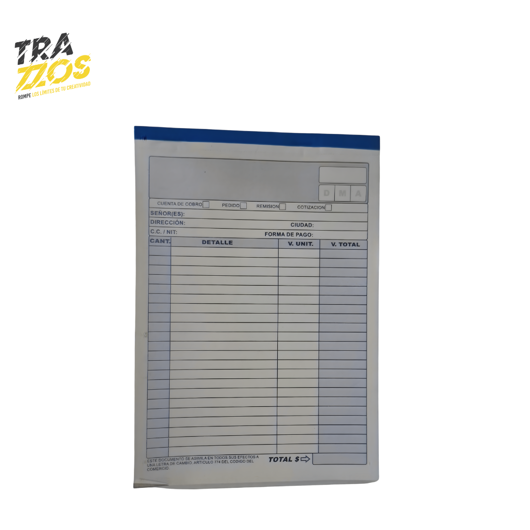 Facturero práctico con papel autocopiante que permite generar duplicados sin necesidad de papel carbón. Ideal para negocios que requieren conservar copia de cada operación de forma rápida y ordenada.