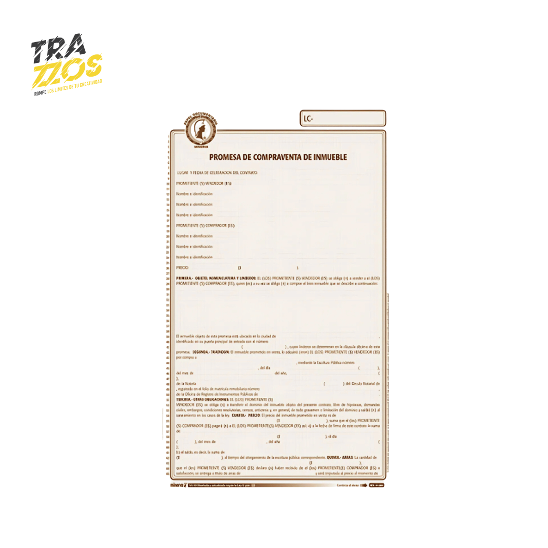 Hoja de papel documentario de seguridad diseñada para establecer acuerdos preliminares entre comprador y vendedor sobre la futura compraventa de un inmueble. Este formato permite dejar constancia legal de las condiciones pactadas antes de la firma del contrato definitivo, brindando respaldo jurídico y claridad entre las partes